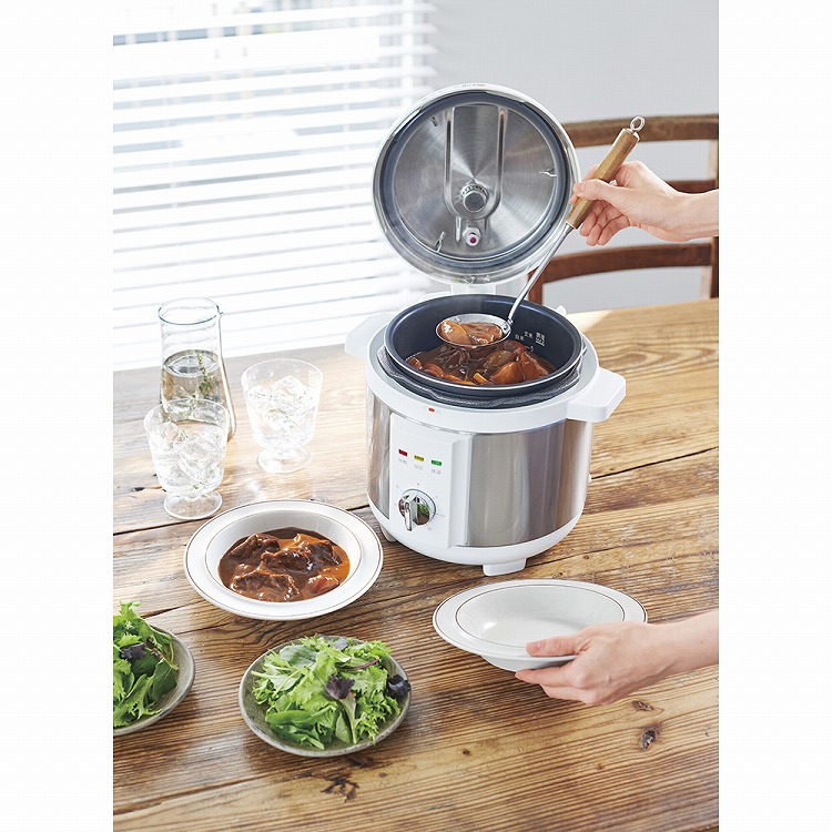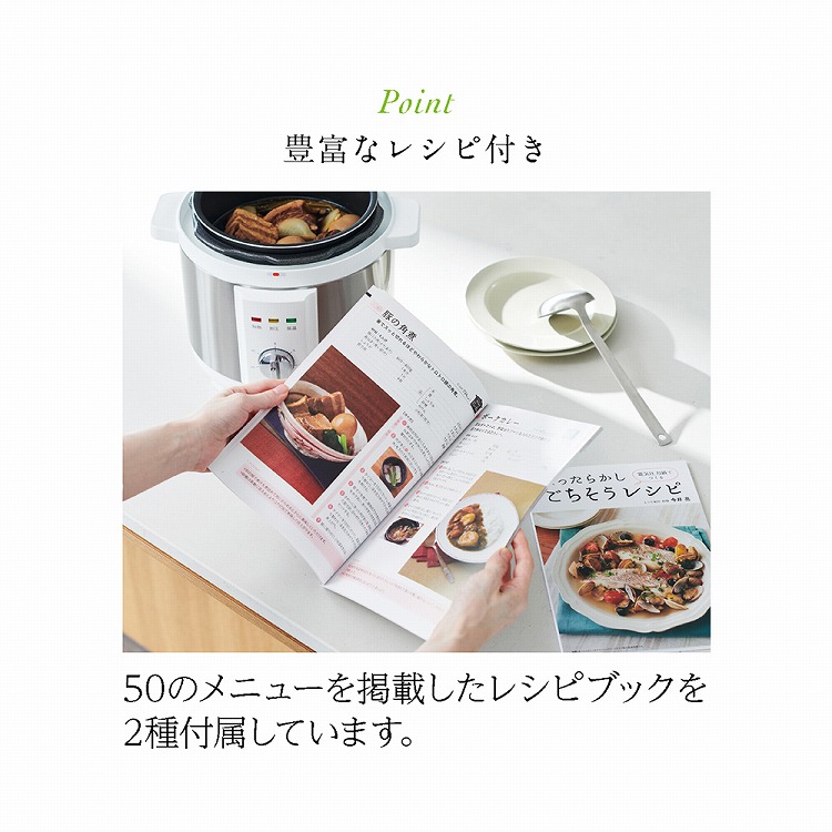 ●内容:計量カップ・しゃもじ・蒸皿・蒸気水受け・安全弁おもり(ふたにセット済み)・電源コード・レシピブック(2冊100種類)・予備用浮き圧力弁シール2個付