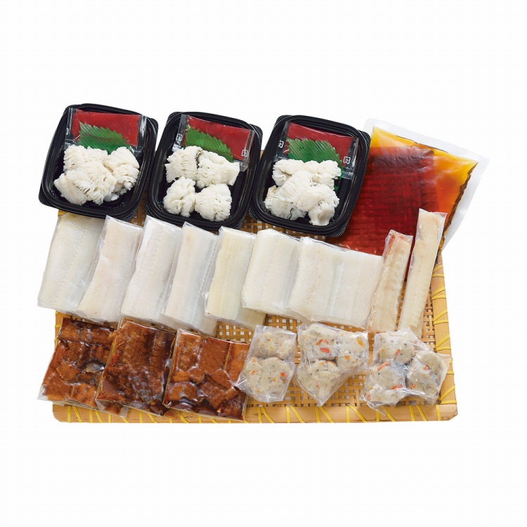 商品内容●セット内容:はも身(骨切済)350g、はも団子×8、はも湯引き50g(梅肉付)・はもひつまぶし50g各3、出し汁・はも骨付