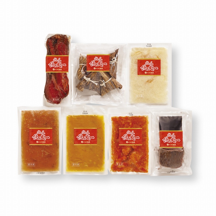 商品内容●セット内容:フカヒレの姿煮蟹みそソース180g・乾焼明蝦(エビチリソース)250g・国産牛ローストビーフ(モモ/国内産)190g(ローストビーフ150g・特製ピリ辛ソース40g)・つるし焼豚430g・魚翅湯(フカヒレ入りスープ)250g・角煮入りちまき240g(4個入)・ふかひれ入粥200g各1
