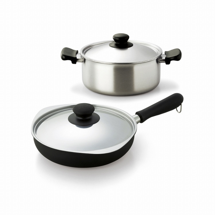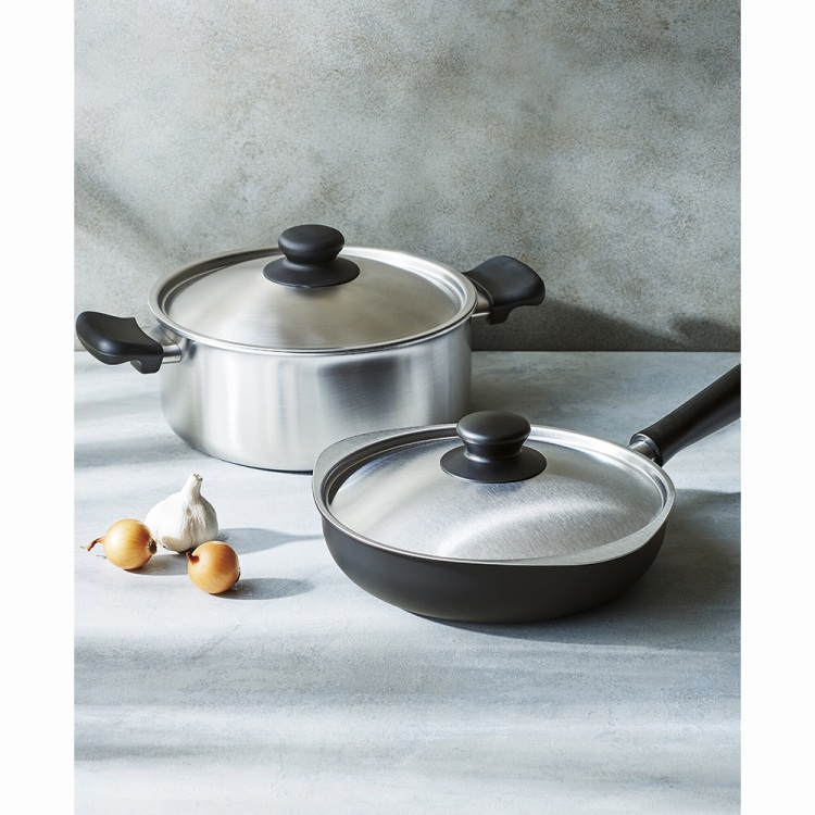 ●材質:両手鍋/(全面三層構造)18-8ステンレス・アルミニウム・18-Tiステンレス(底厚2.6mm)、フライパン/(本体)鉄(マグマプレート・底厚1.2mm)・(蓋)ステンレス