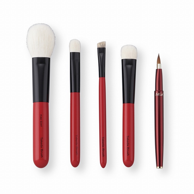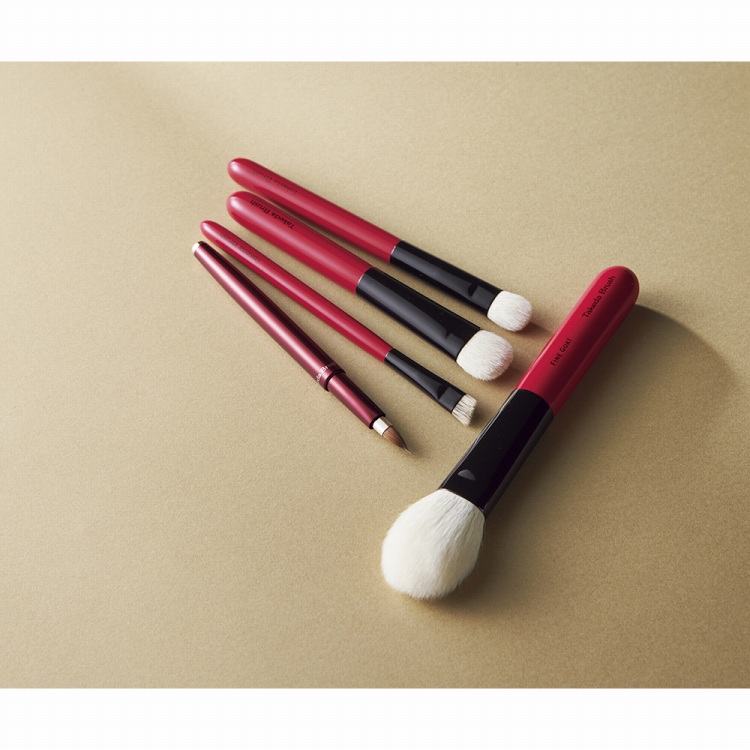●材質:チークブラシ/特殊整毛山羊毛(準粗光峰)・木・真鍮(黒クロムメッキ)、シャドウブラシ・シャドウブラシ大/特殊整毛山羊毛(細光峰)・木・真鍮(黒クロムメッキ)、アイブロウブラシ/パーミー毛・木・真鍮(黒クロムメッキ)、携帯用リップブラシ/イタチ毛・アルミニウム(アルマイト加工)