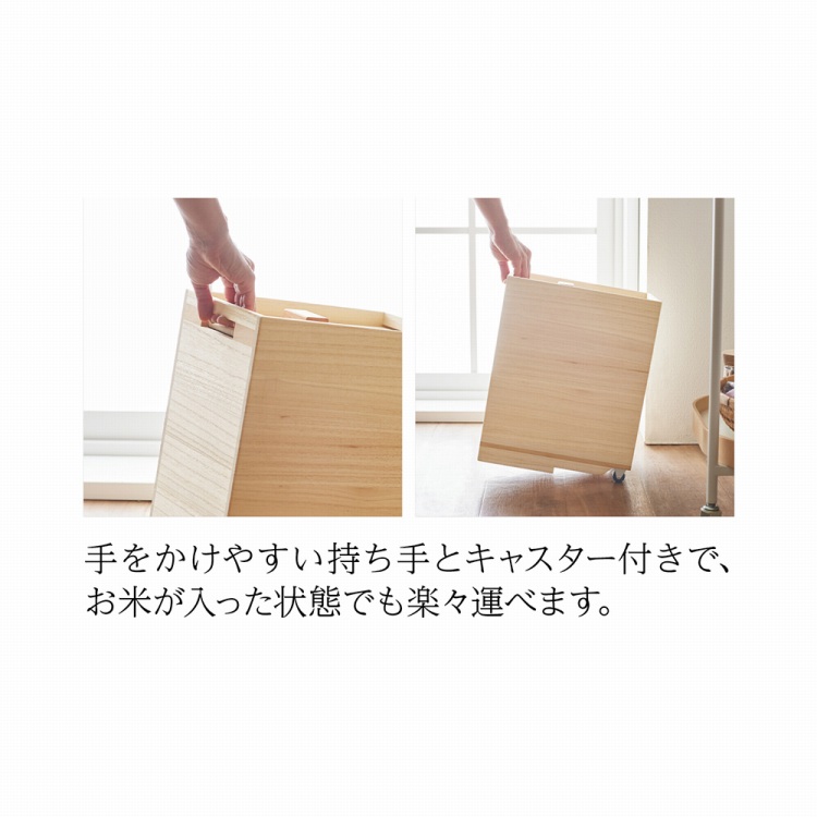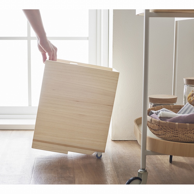 使いやすさを、型付けの関係性を追求してできた、古くて新しい米びつのカタチ。シンプルで温かみのある桐のもつ調湿性と防虫効果がお米を美味しく保ちます。蓋の取手は、縁に引っ掛け地面に置かず衛生的に使えます。キャスターがついて運びやすい野菜保存箱は、通気性を考え底面と側面をスノコに。寸法規格を揃えているので並べて美しい一体感が生まれます。「増田桐箱店」は創業は1929年の老舗。3代目の若社長は、大切なものをいれる「箱」を主役にしたいという想いから、新しい「kirihaco」のスタイルを生み出し、アイディアあふれるユニークな商品を次々と作っています。