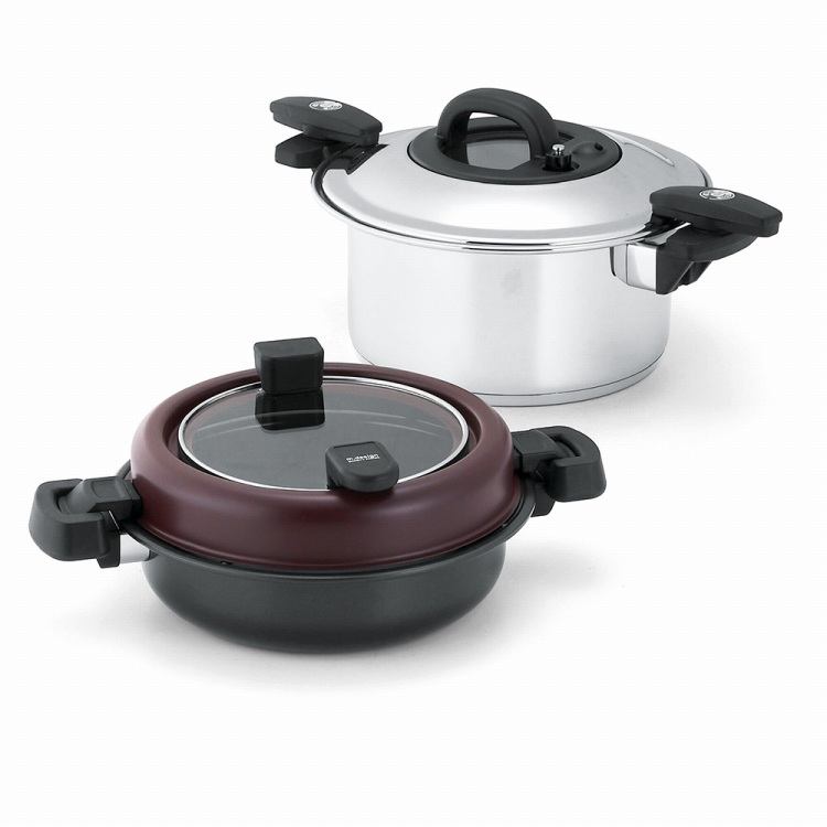 やさしい圧力で調理する調圧鍋と油ハネを防ぐガラス蓋付きのフライヤーのセット。