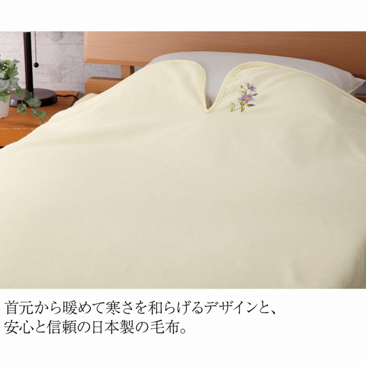 首をすっぽり包み込んで温かさを逃がさない首元のカットがポイントの、ロングタイプ毛布です。