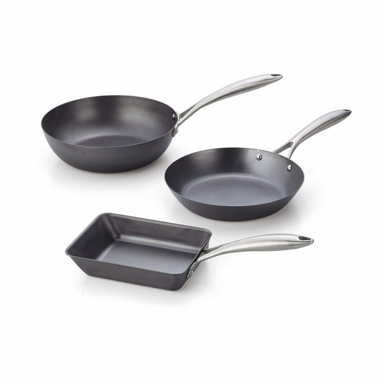 ●材質:本体/鉄(フライパン・ウォックパン/底厚1.6mm、エッグパン/底厚1.5mm)、ハンドル/ステンレススチール