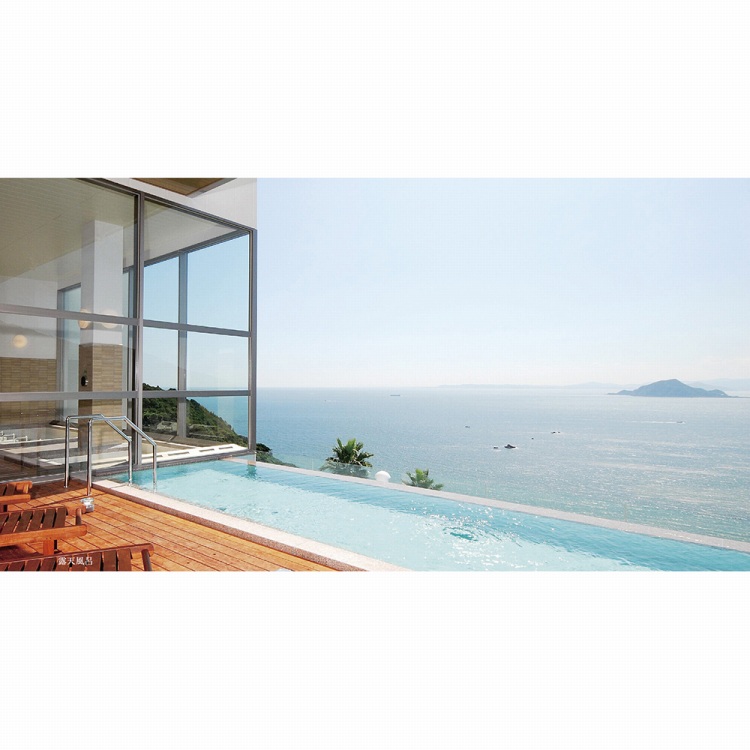 海へと流れ続くようにデザインされた露天風呂と内湯。