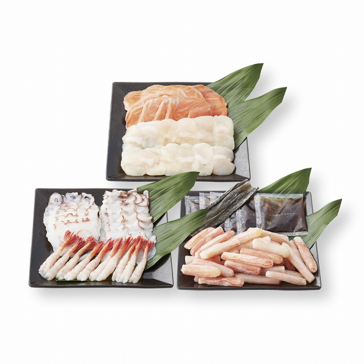 ●セット内容:ズワイガニ棒ポーション300g、たこスライス200g、帆立貝柱スライス200g、トラウトサーモンスライス200g、甘えび×10、だし用昆布・たれ付