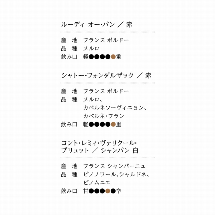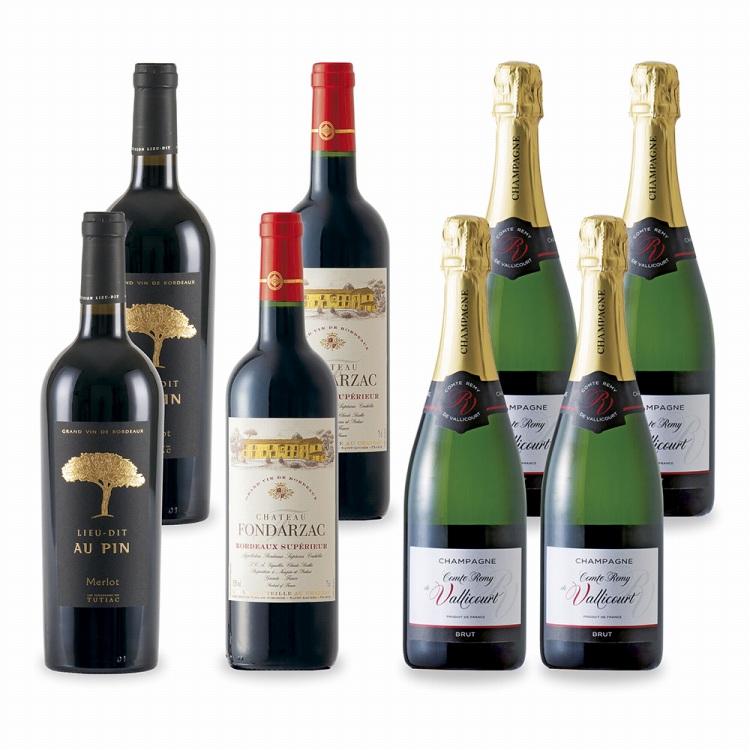 商品内容●ルーディ オー・パン750ml×2、シャトー・フォンダルザック750ml×2、コント・レミィ・ヴァリクール・ブリュット750ml×4