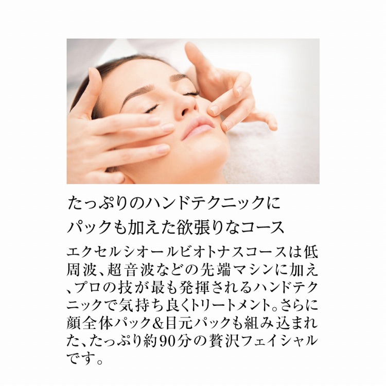 商品内容●内容:エクセルシオールビオトナス約90分・速攻ビタミントリートメント約60分・ロミロミ約50分