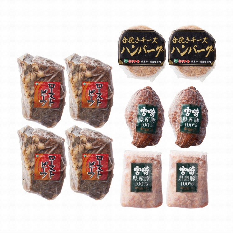 商品内容●セット内容:ローストビーフ(モモ/宮崎県産)400g×4、合挽チーズハンバーグ2個入(合計200g)・焼豚230g・フライッシュケーゼ400g各2、ローストビーフソース・ハンバーグソース付