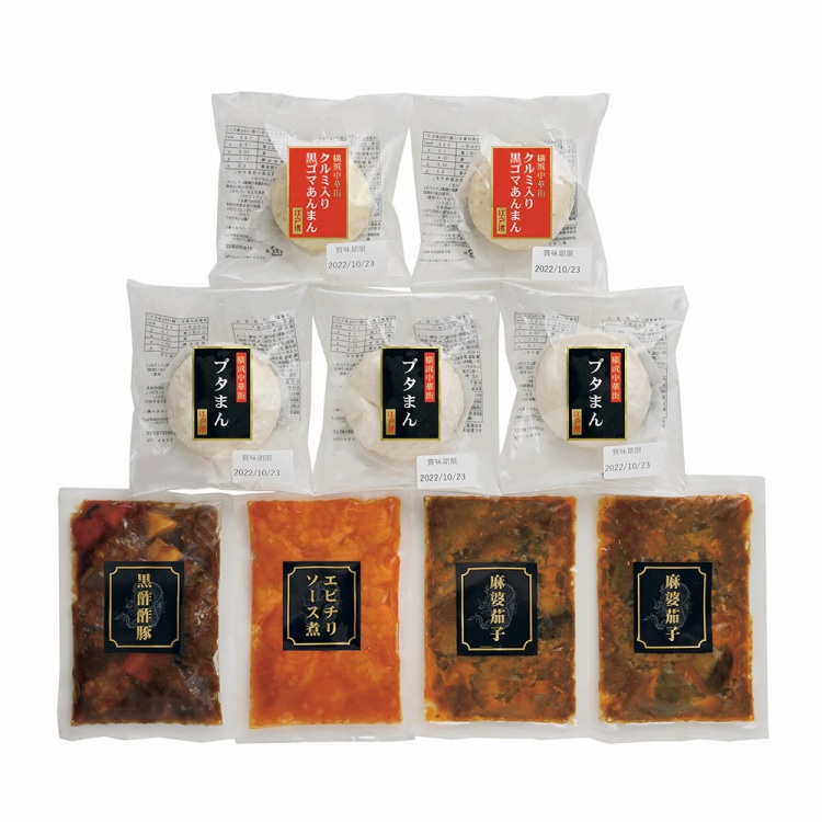 商品内容●セット内容:ブタまん120g×3、クルミ入り黒ゴマあんまん100g・麻婆茄子170g各2、黒酢酢豚170g・エビチリソース煮170g各1