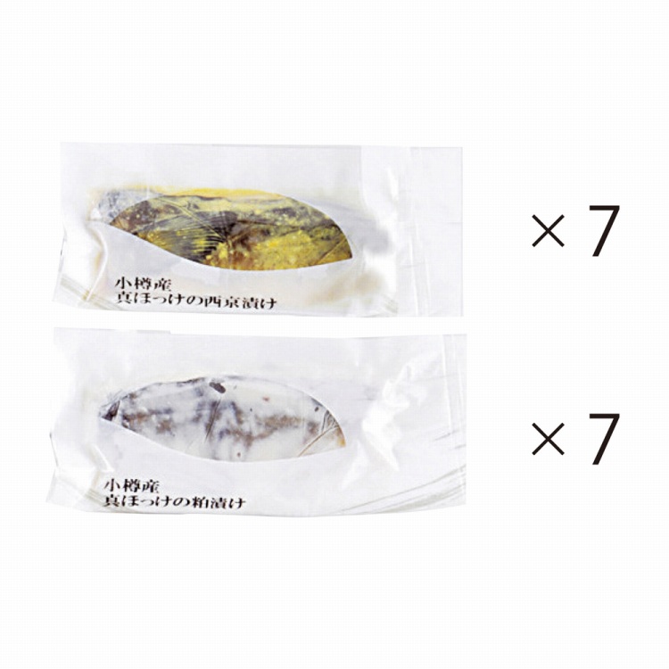 北海道小樽で水揚げした「ほっけ」を半身にし、小樽の酒粕を使った「粕漬け」と風味豊かな「西京漬け」に仕上げました。