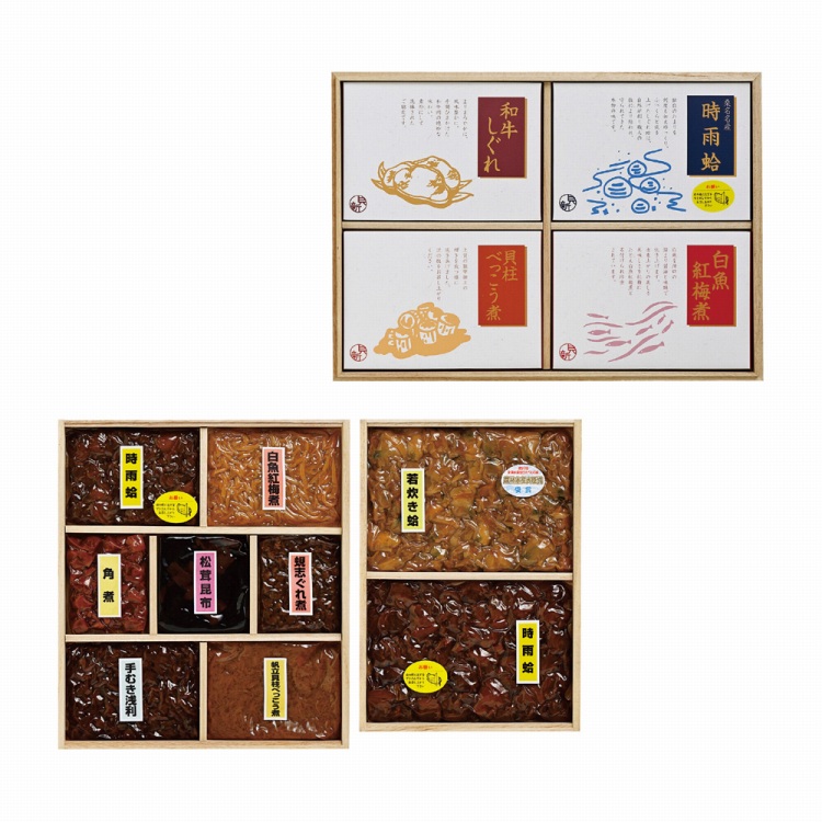 商品内容●セット内容:若炊き蛤230g・時雨蛤230g・時雨蛤119g・時雨蛤110g・和牛しぐれ110g・角煮100g・松茸昆布90g・帆立貝柱べっ甲煮90g・貝柱べっこう煮90g・手むき浅利110g・白魚紅梅煮90g・蜆志ぐれ煮85g・白魚紅梅煮75g各1