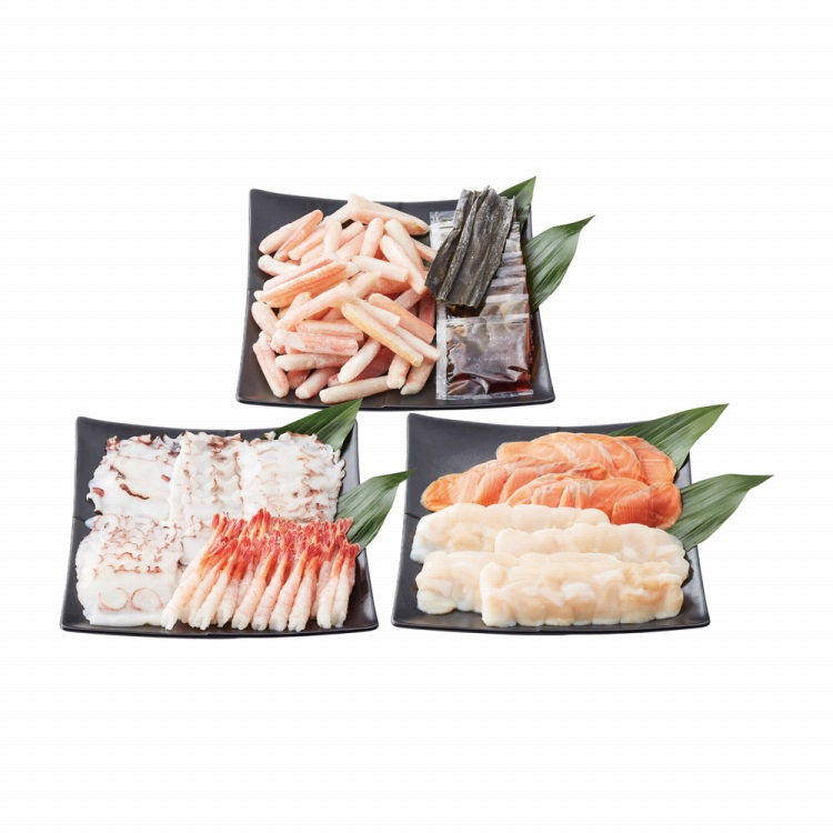 商品内容●セット内容:ズワイガニ棒ポーション600g、たこスライス400g、帆立貝柱スライス400g、トラウトサーモンスライス300g、甘えび×30、だし用昆布・たれ付