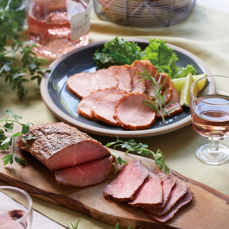 素材の味を活かして丁寧にじっくり焼き上げたローストビーフと、国産の豚肉を使用したハンバーグのセットです。