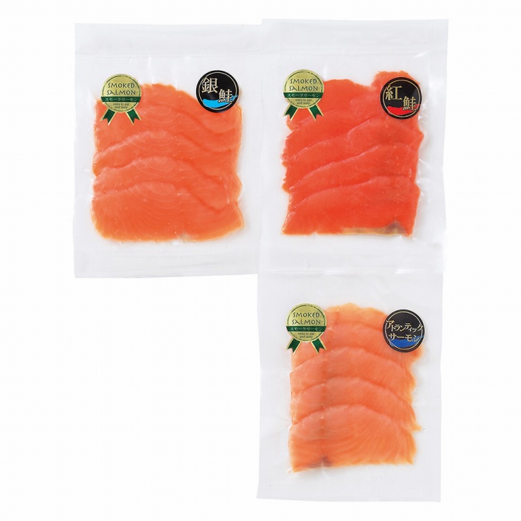 商品内容●セット内容:銀鮭スモークスライス50g・紅鮭スモークスライス50g・アトランティックサーモンスモークスライス50g各1