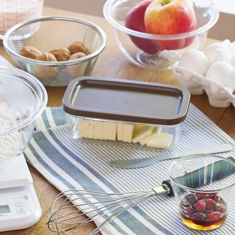 フタでギュッと押すと、200gのバターを一切れ約5gにカットできます。