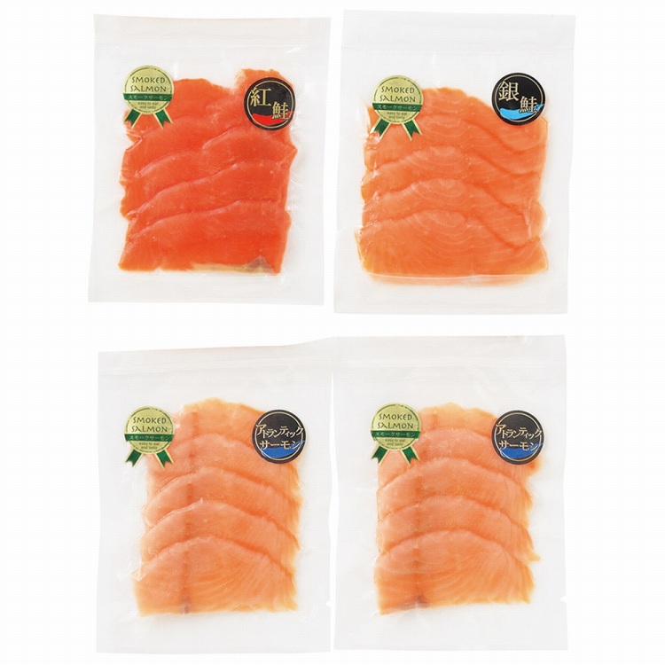 商品内容●セット内容:アトランティックサーモンスモークスライス50g×2、銀鮭スモークスライス50g・紅鮭スモークスライス50g各1
