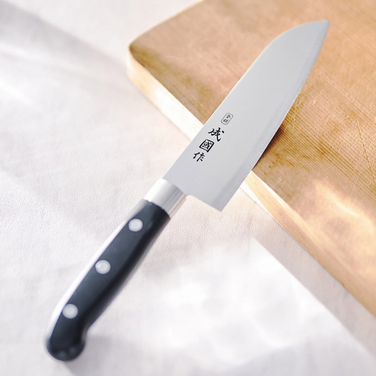 ステンレス口金付きで、丈夫な作りの使い勝手がよい三徳包丁です。
