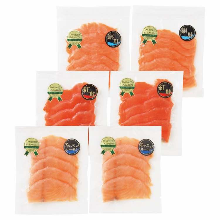 商品内容●セット内容:銀鮭スモークスライス50g・紅鮭スモークスライス50g・アトランティックサーモンスモークスライス50g各2