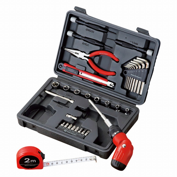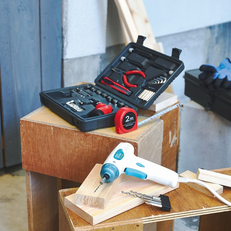 ●内容:六角棒レンチ・6.35mm角ソケット・ドライバービット各8・精密ドライバー×3・段付ビット×2・ラジオペンチ125mm・カッターS型・ラチェットドライバー(手動式)・6.35mm角ソケットアダプター・コンベックス2m各1付