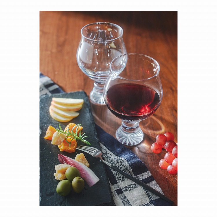 口元の繊細な返しと独特の曲線を描くボディラインのワイングラス。