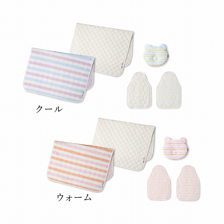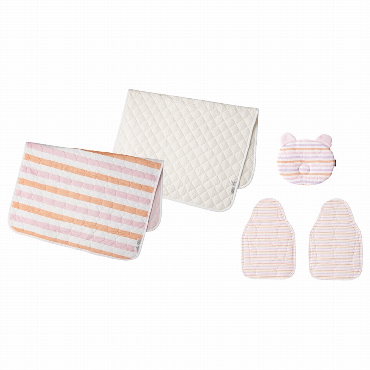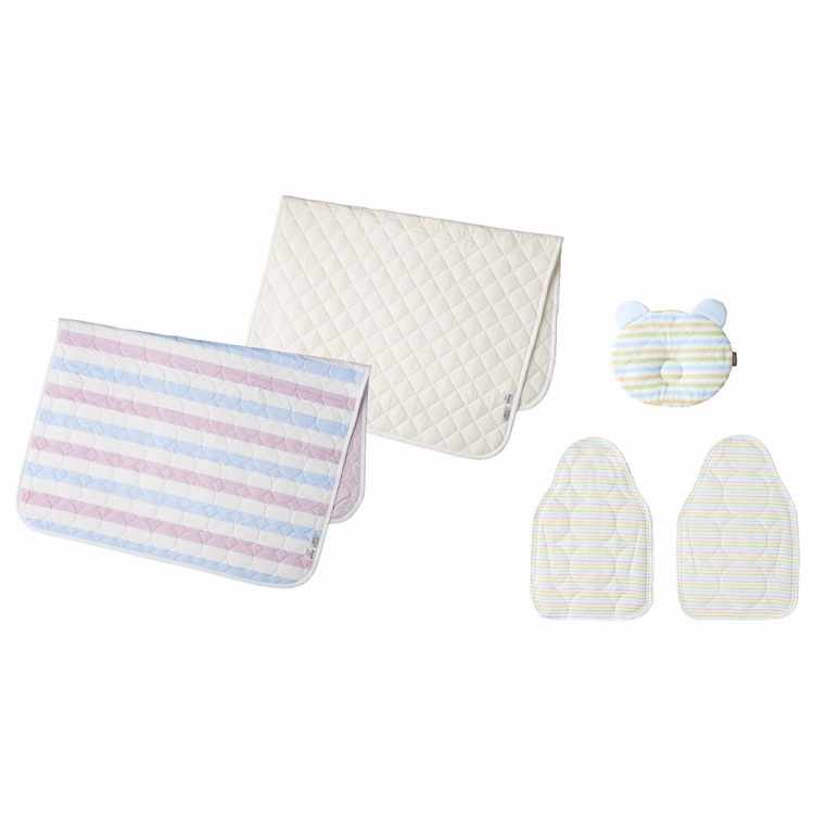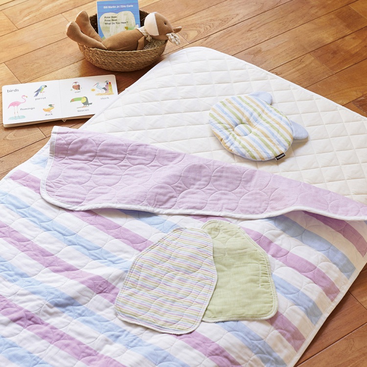 脱脂綿を使用した中わたをガーゼで挟んだ、薄くて軽いキルトケットやパットシーツのセット。