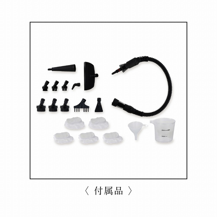 ●内容:布カバー×5・ブラシ・ブラシ大各3・ストレートノズル・延長ホース・アングルノズル・サッシ用ブラシ・リトルスクレーパー・アタッチメント・ジョウゴ・メジャーカップ各1・コードの長さ約4m・連続使用時間約11分