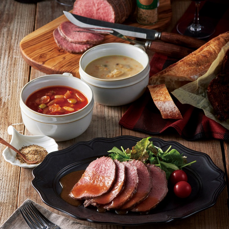 商品内容●セット内容:黒毛和牛ローストビーフ(モモ)400g×1、グレービーソース・シーズニングソルト付、アサリと野菜のクリームスープ160g・季節の野菜トマトブイヨンスープ160g・若鶏とレンズ豆のココナッツカレースープ160g各4