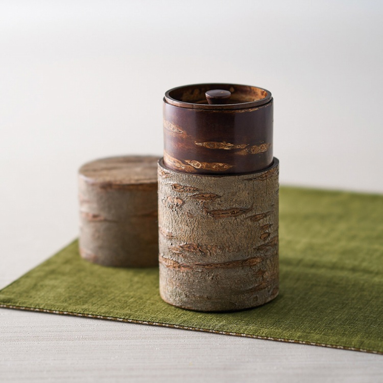 筒の表面と内側、蓋すべてに桜皮を使った総皮づくりで、手の平にすっぽりと収まる細型タイプの茶筒です。