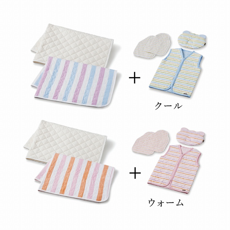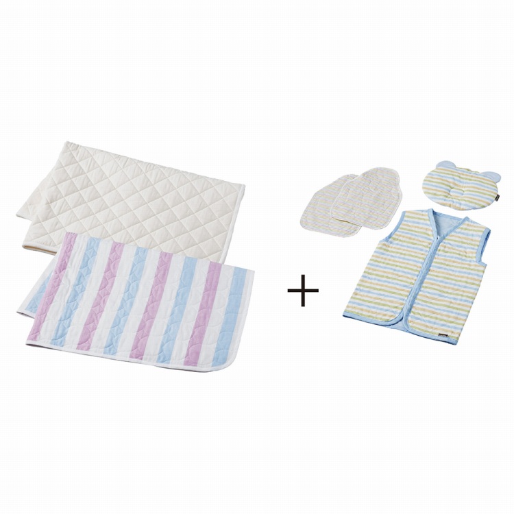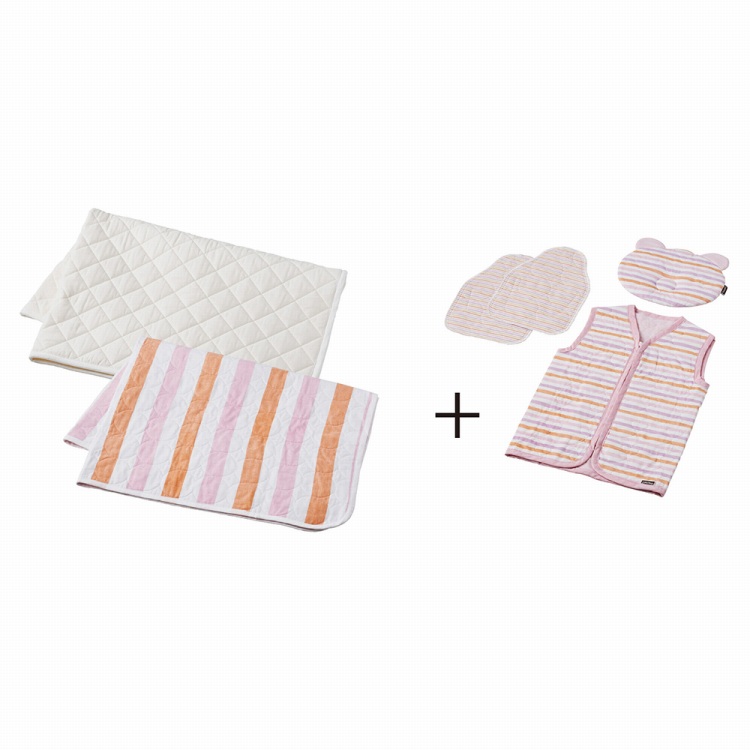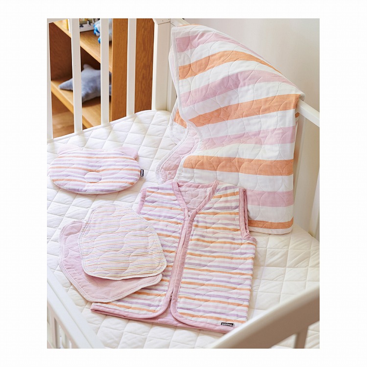 脱脂綿を使用した中わたをガーゼで挟んだ、薄くて軽いキルトケットやスリーパーなど6点セット。