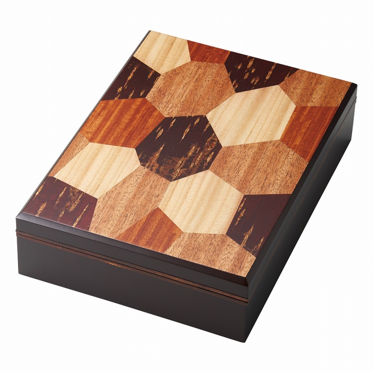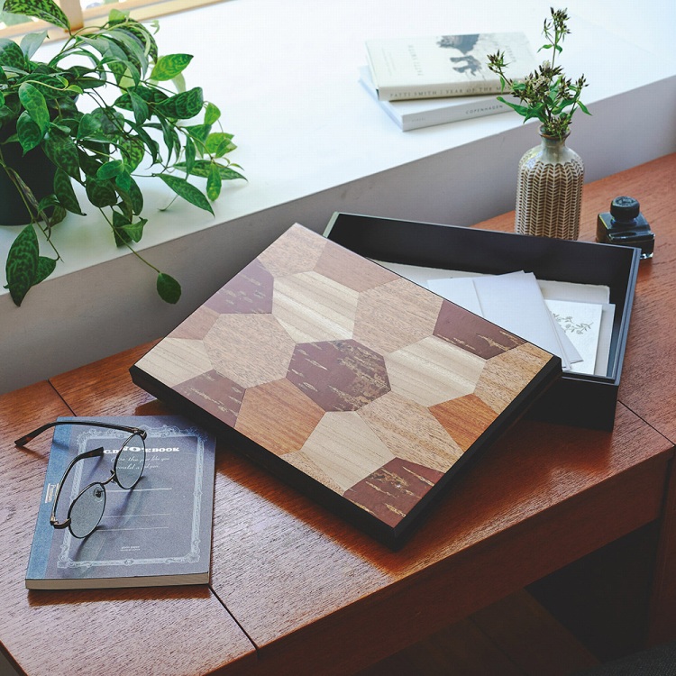 蓋の表面に山桜の樹皮のほか、薄くスライスしたいろいろな木を貼った、自然の温もりあふれる寄木細工のドキュメントケース。