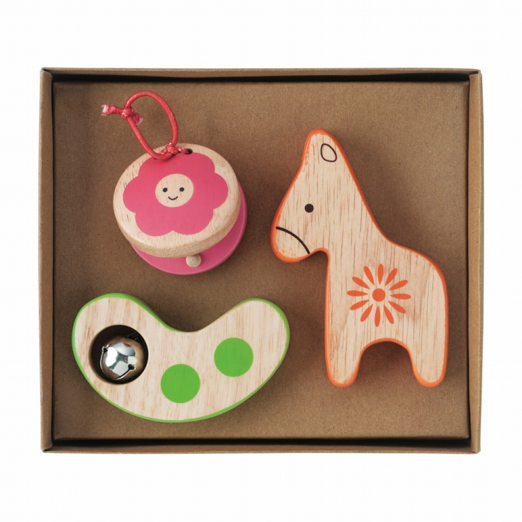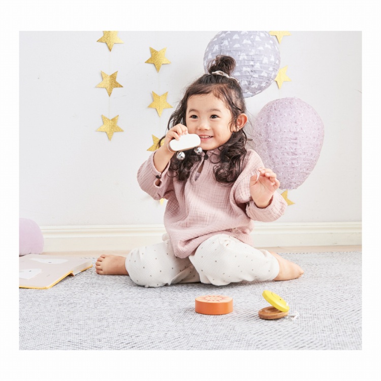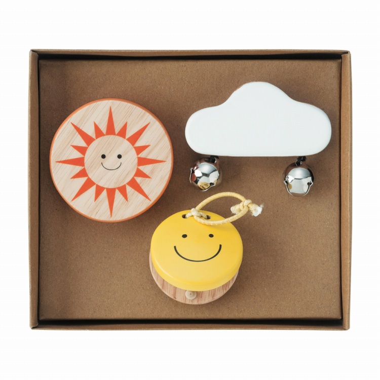 “どうぶつなかよし”はブレーメンの音楽隊、“そらのかお”は北風と太陽、“ロバとはらっぱ”はジャックと豆の木のお話をイメージしてデザインされた、ベル・シェーカー・カスタネットの音が楽しめる楽器セット。