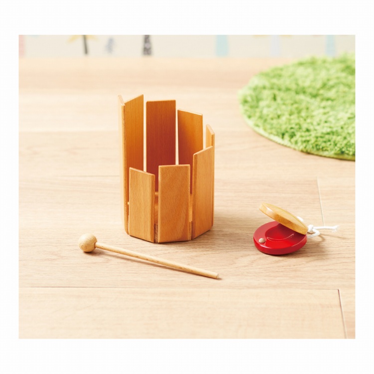 内側をなでるように回すとカラコロと音色が響くチャイムとカスタネットのセット。