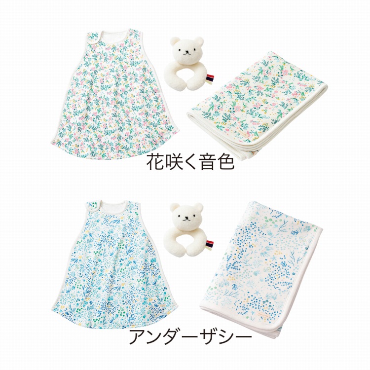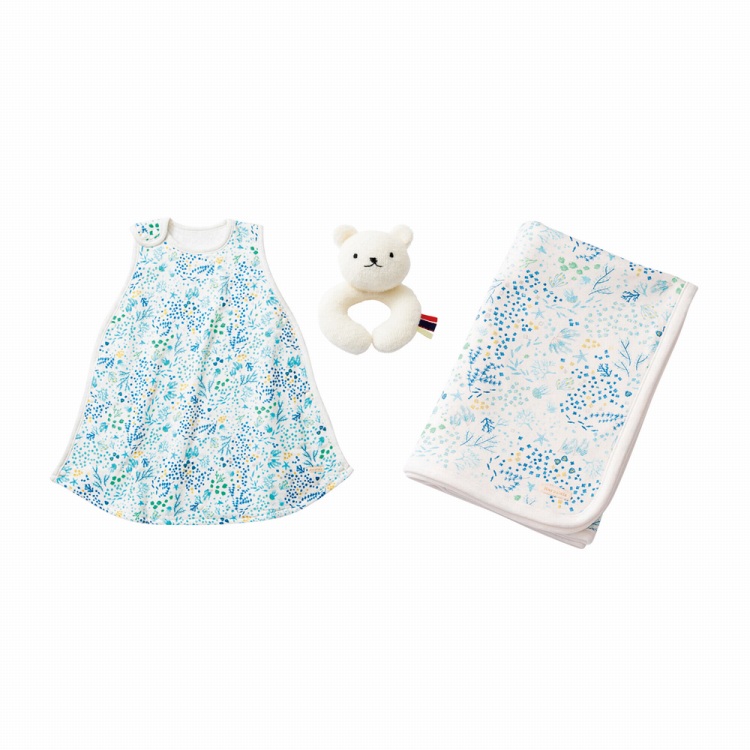 ●材質:スリーパー・ブランケット/綿100%(オーガニックコットン100%使用)、ラトル/(側地)綿100%(オーガニックコットン100%使用)・(中わた・リボン)ポリエステル100%