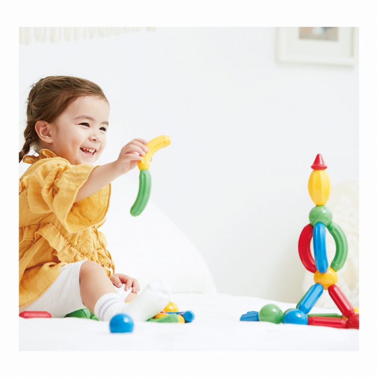 小さな手でも握りやすく、ピースは磁石でくっつくので簡単に組み立てあそびが楽しめます。