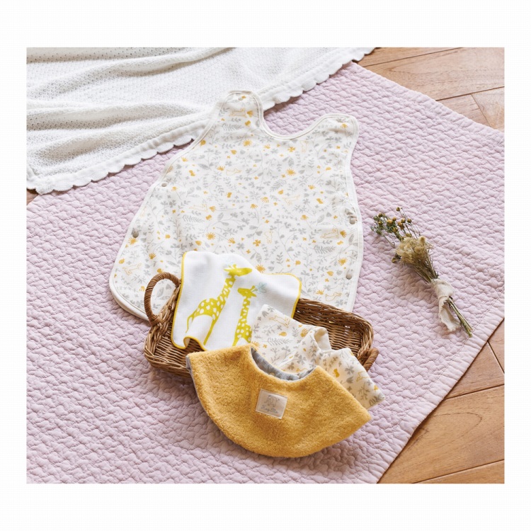 ●材質:ガーゼスリーパー/綿100%(表地/オーガニックコットン100%使用)、ガーゼスタイ/綿100%(オーガニックコットン100%使用)、パイルスタイ/綿100%(表地/パイル、裏地/ガーゼ)、ガーゼハンカチ/綿100%(表地/ガーゼ、裏地/パイル)