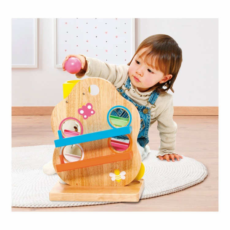 黄色のえんとつにボールを入れるとスロープを転がり、最後にはチリンと鈴の音を鳴らします。