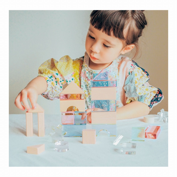アクリルの透明感と木の温もりの異素材を楽しめる積み木。