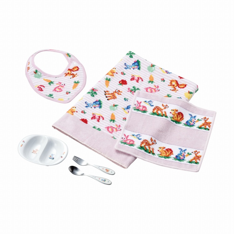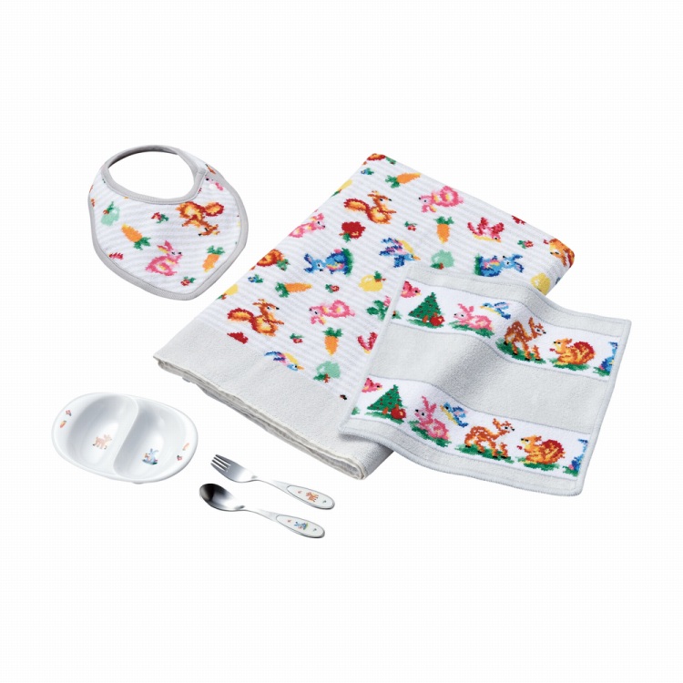 ●材質:スタイ/(本体)綿100%(シュニール織)・(フチ部分)綿100%、ハンカチ・プティバス/綿100%(シュニール織)、ミニプレート/強化耐熱磁器、フォーク・スプーン/ステンレス・エポキシ樹脂