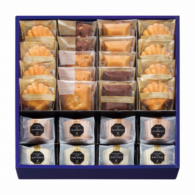 商品内容●セット内容:マドレーヌ×8、トリュフケーキ・ガトー オ マロン各4、フィナンシェ・ヌーヴェルガレット(バニラ)各3、フィナンシェショコラ・ヌーヴェルガレット(チョコ)各2