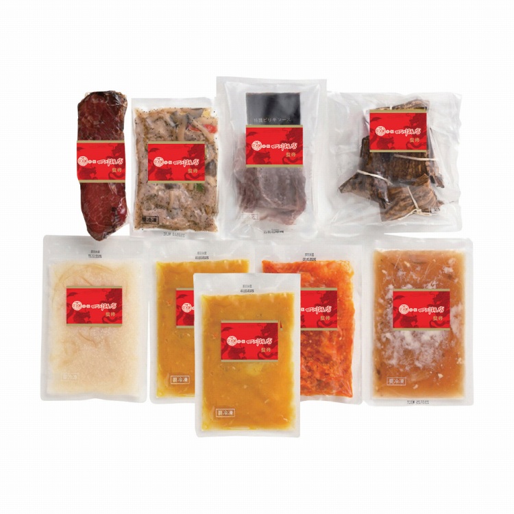 商品内容●セット内容:フカヒレの姿煮蟹みそソース180g×2、乾焼明蝦(エビチリソース)250g・国産牛ローストビーフ(モモ/国内産)190g(ローストビーフ150g・特製ピリ辛ソース40g)・つるし焼豚430g・牛サーロインの黒胡椒炒め180g・魚翅湯(フカヒレ入りスープ)250g・角煮入りちまき240g(4個入)・ふかひれ入粥200g各1