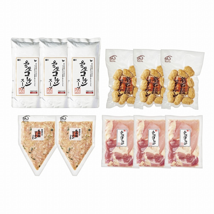商品内容●セット内容:名古屋コーチンミックス(モモ・ムネ)切り身200g・名古屋コーチン入りつくね200g・スープ600g各3、名古屋コーチン入りつみれ200g×2