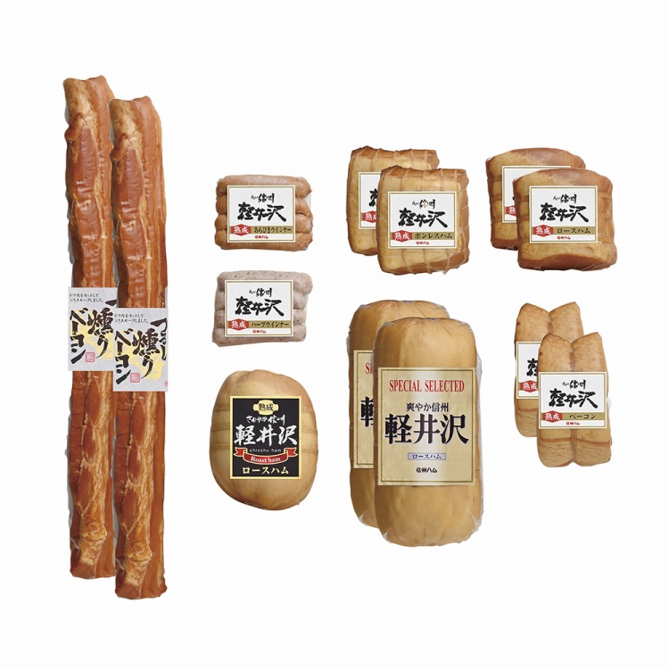 商品内容●セット内容:スペシャル軽井沢熟成ロースハム900g・軽井沢熟成ロースハム360g・軽井沢熟成ボンレスハム300g・軽井沢熟成ベーコン250g・つるし燻りベーコン330g各2、軽井沢熟成布巻ロースハム580g・軽井沢熟成あらびきウインナー75g・軽井沢熟成ハーブウインナー75g各1