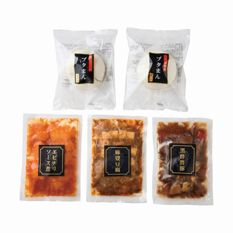 商品内容●セット内容:ブタまん120g×2、黒酢酢豚170g・麻婆豆腐170g・エビチリソース煮170g各1