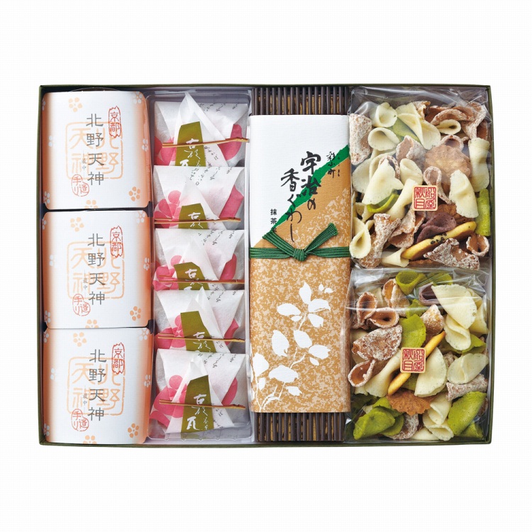 商品内容●セット内容:古都瓦×5、北野天神×3、吹き寄せ65g×2、宇治の香ぐわし×1