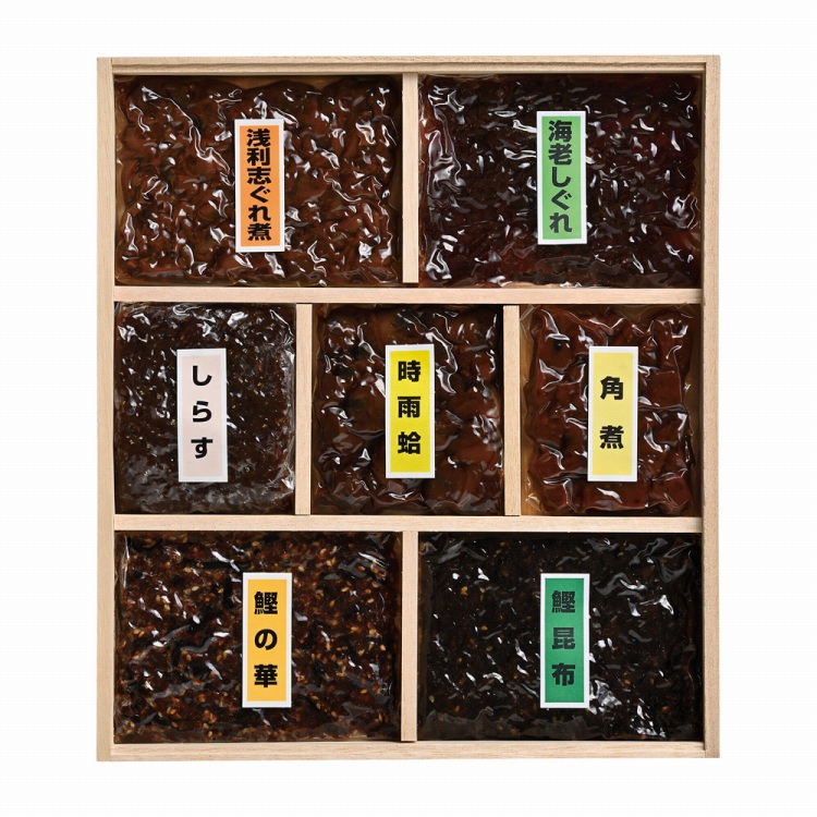 商品内容●セット内容:浅利志ぐれ煮75g・海老しぐれ50g・しらす50g・時雨蛤60g・角煮78g・鰹の華55g・鰹昆布75g各1