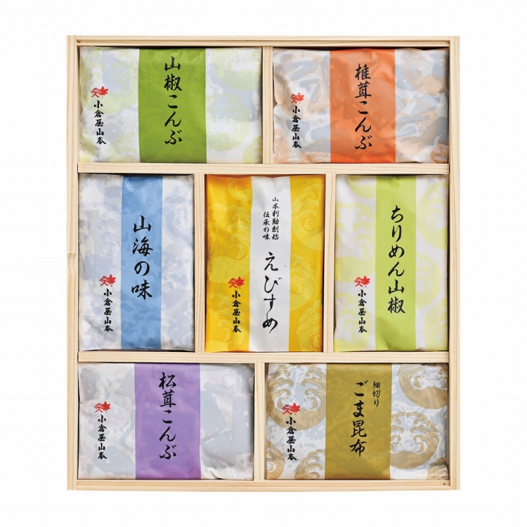商品内容●セット内容:松茸こんぶ60g・椎茸こんぶ60g・山海の味60g・山椒こんぶ60g・細切りごま昆布60g・えびすめ45g・ちりめん山椒25g各1