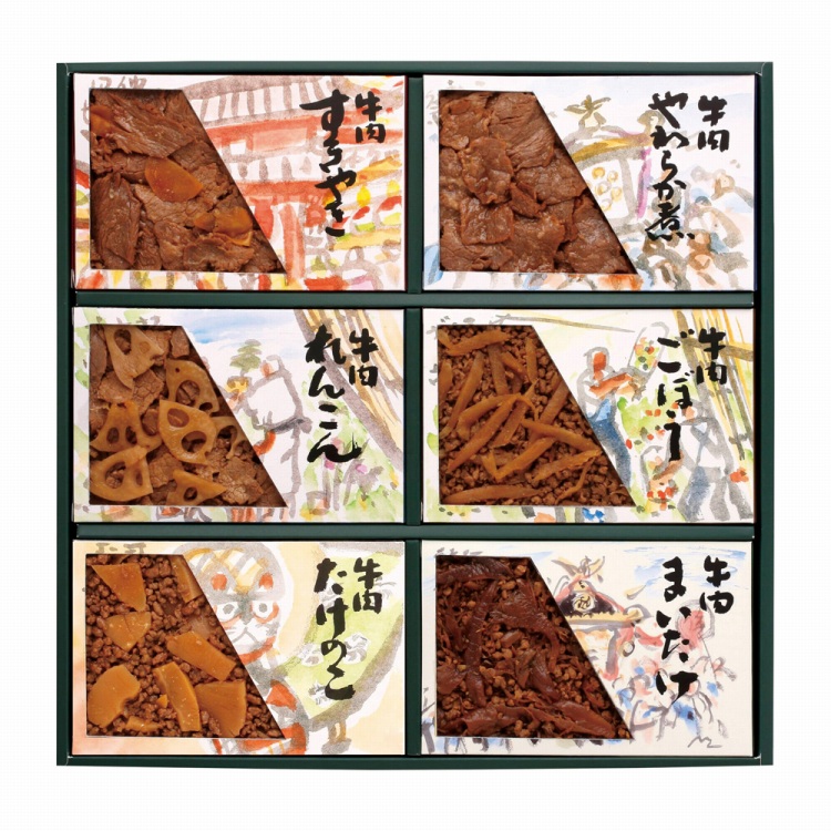 商品内容●セット内容:牛肉すきやき60g・牛肉やわらか煮60g・牛肉ごぼう60g・牛肉れんこん60g・牛肉まいたけ60g・牛肉たけのこ60g各1