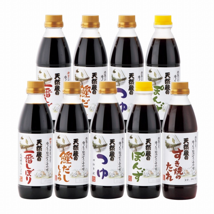 商品内容●セット内容:一番しぼりしょうゆ500ml・鰹だししょうゆ500ml・つゆ500ml・ぽんず500ml各2、すき焼のたれ500ml×1